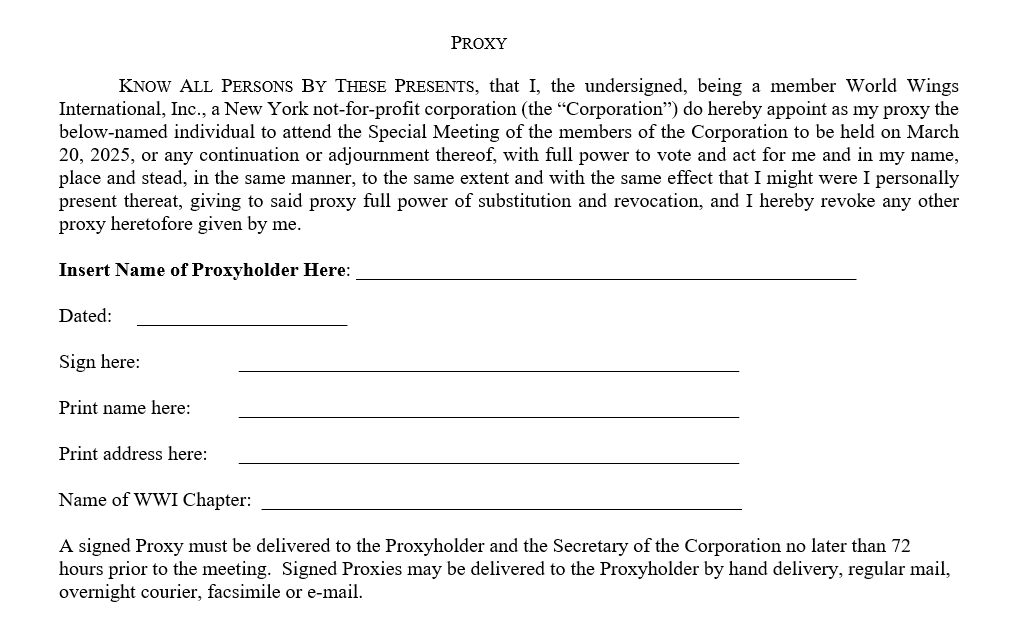 • Voting Process: Each World Wings member is entitled to one (1) equally weighted vote, per our governing documents. Note that Honorary and Affiliate members are NOT eligible to vote.